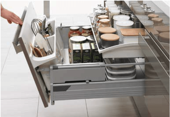 収納量をアップして取り出しやすさも向上した内引出しにはラップやボウル、スクイーザーなどのキッチン⼩物が使い勝⼿よく整理・収納出来ます。