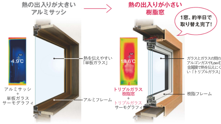 断熱性能の低い単板ガラスから、複層ガラスに変えることで断熱効果が高まります。