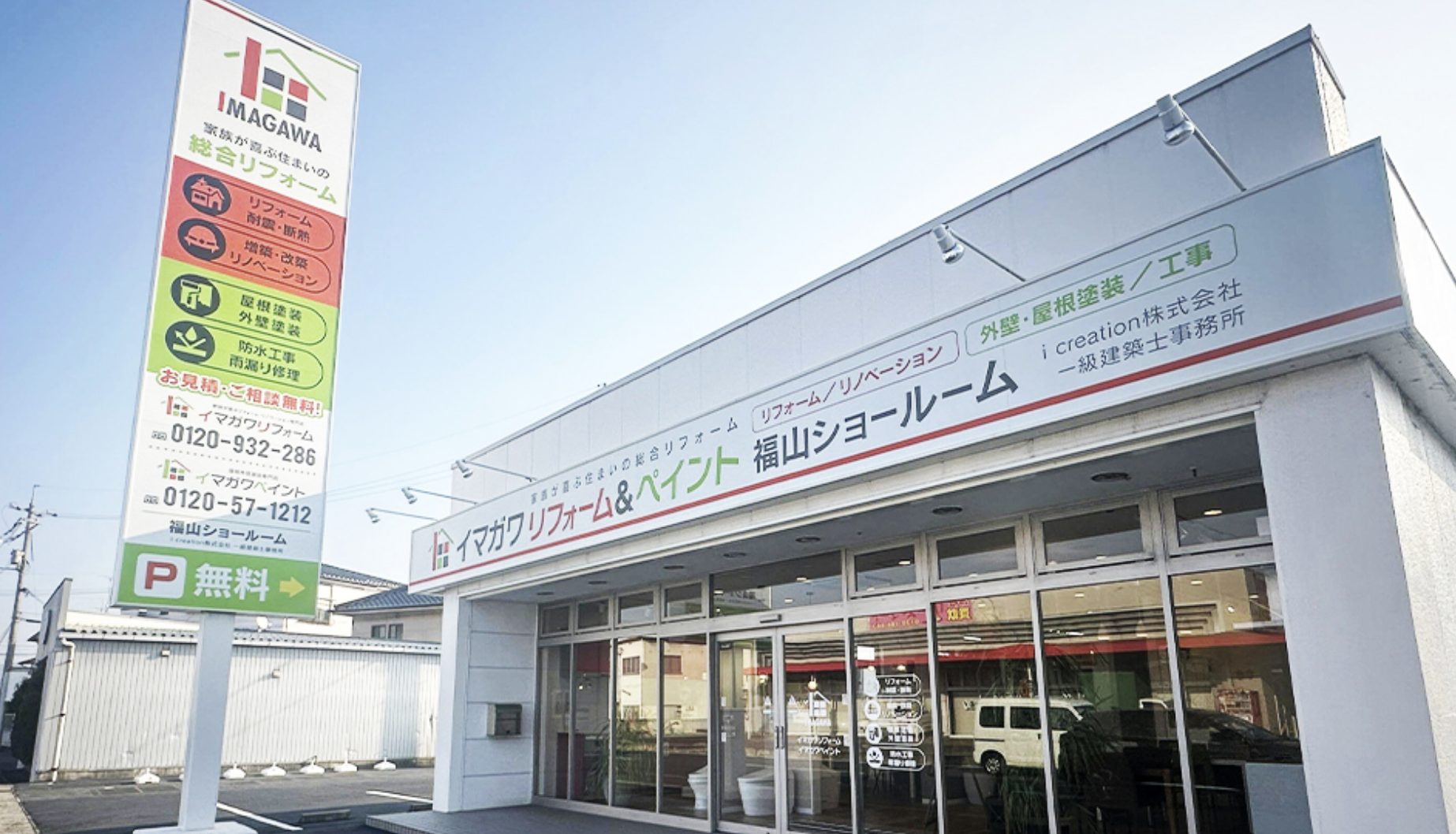 イマガワリフォームでは、福山市に3箇所、笠岡市に1箇所のショールームを展開しており、実際の外壁材サンプルや過去の施工事例写真を豊富に展示しています。明るく開放的な空間で、専門スタッフが丁寧にご相談に応じますので、安心してご来店いただけます。