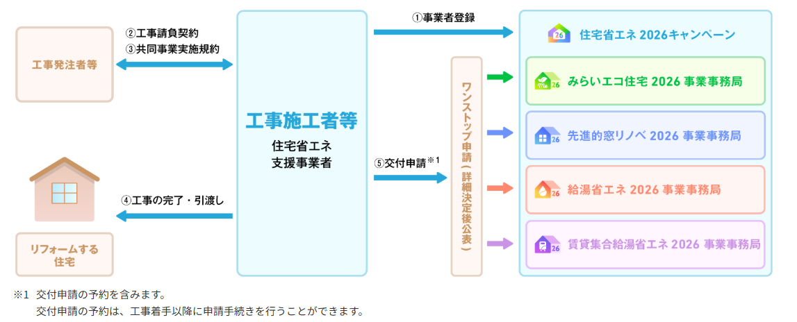 補助金の交付申請等の手続きは個人ではできず、予め「住宅省エネ支援事業者」として登録した工事施工者がおこないます。
