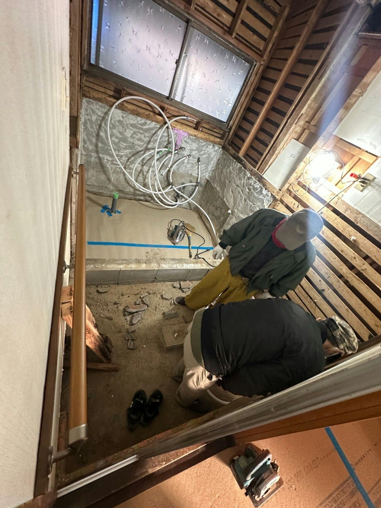 全部外したらこんな風になっているんだ…と驚いてしまいますね🤔ここから大工さんが洗面所の床を1から造作していきます。