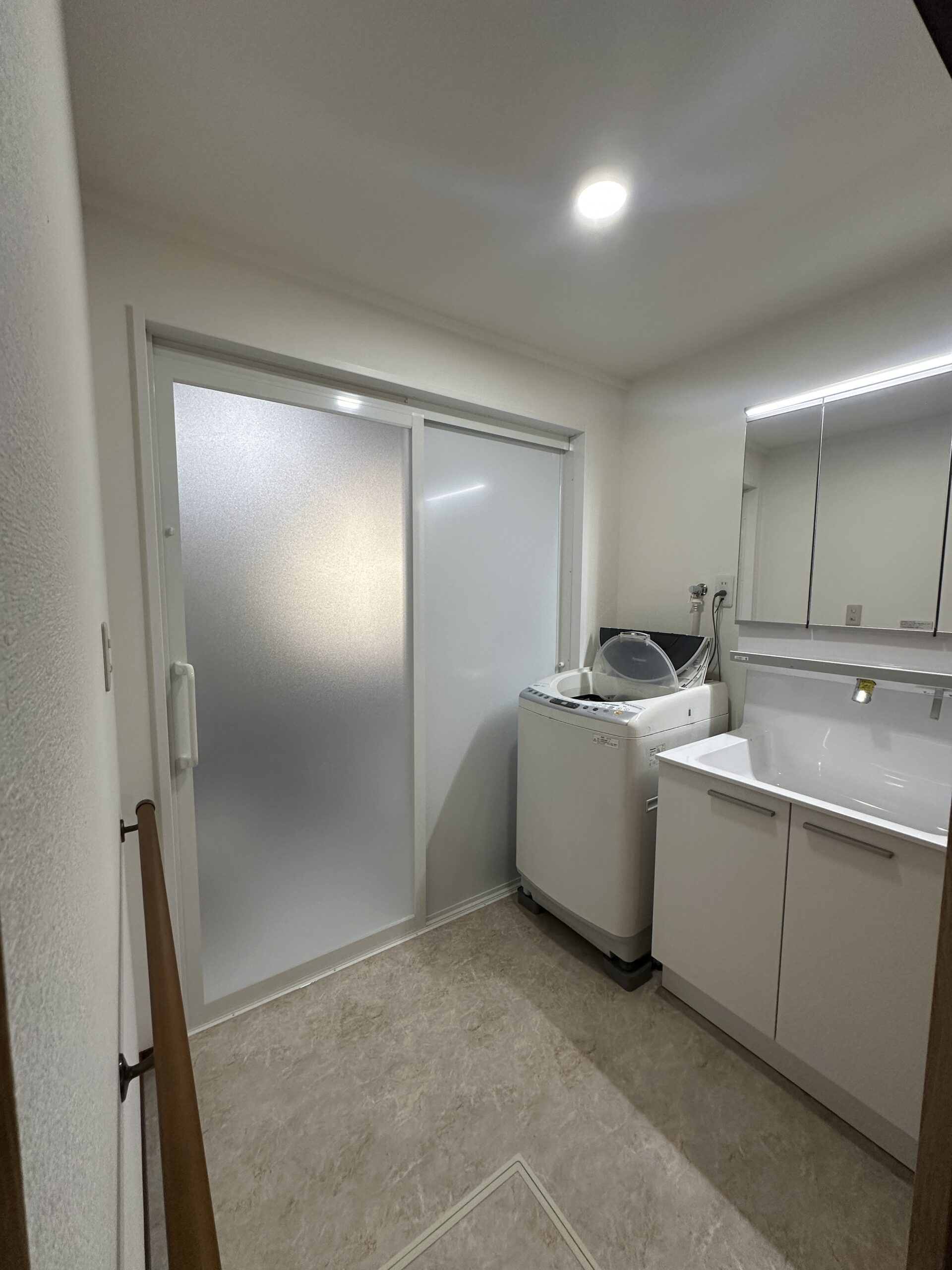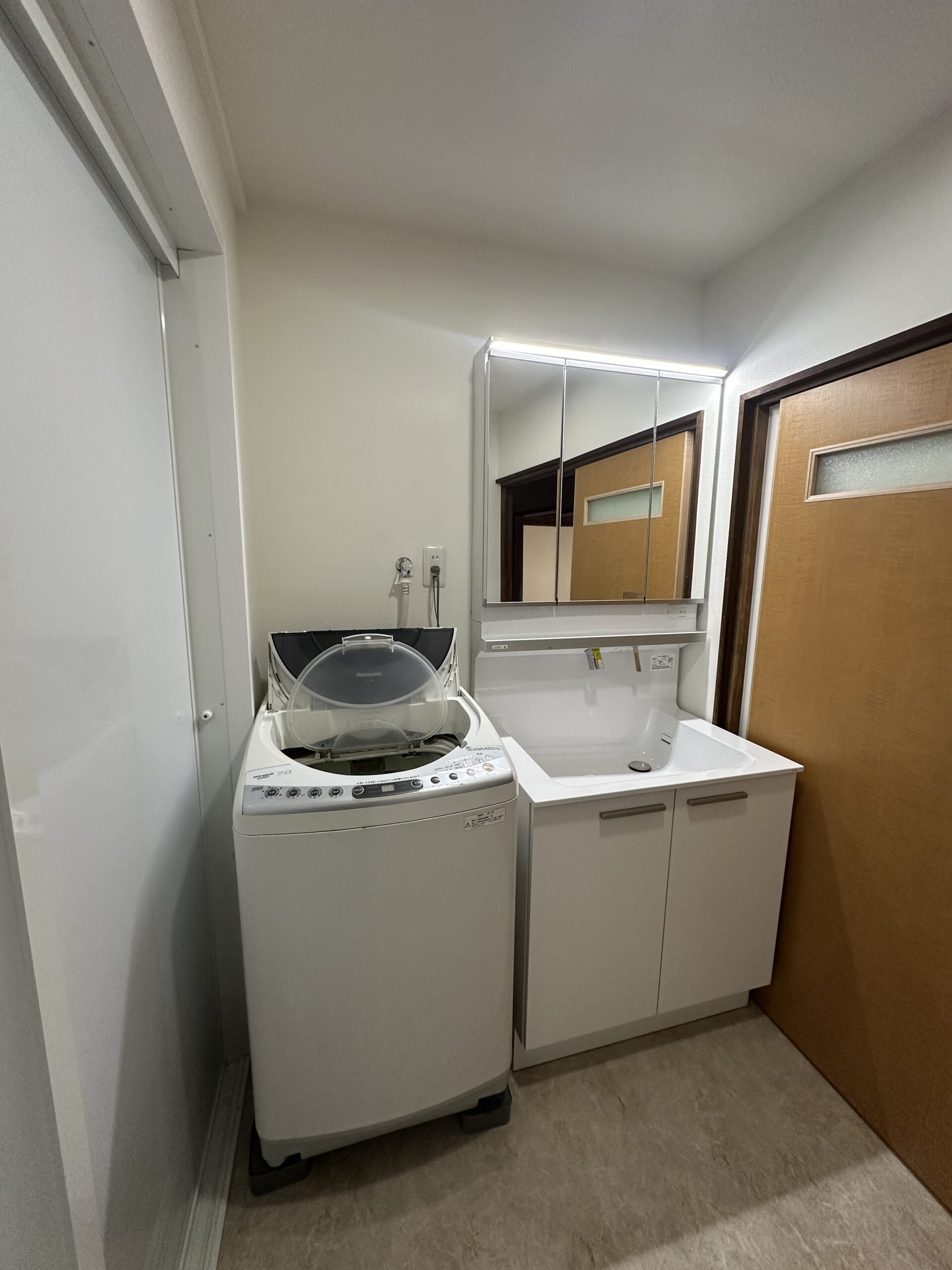 大きな三面鏡の洗面台を設置し、既存の洗濯機もピッタリとおさまっております✨