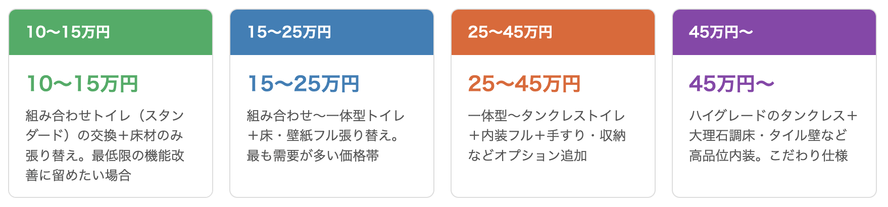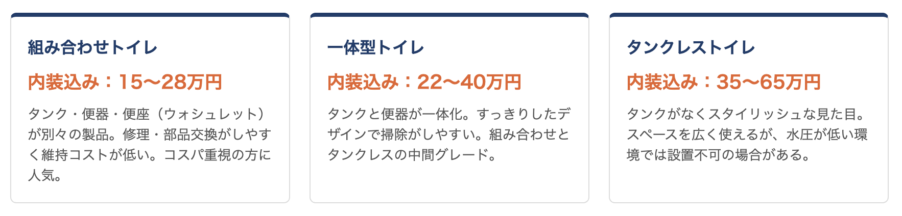 - 便器タイプ別:組み合わせ(15〜28万円)・一体型(22〜40万円)・タンクレス(35〜65万円)