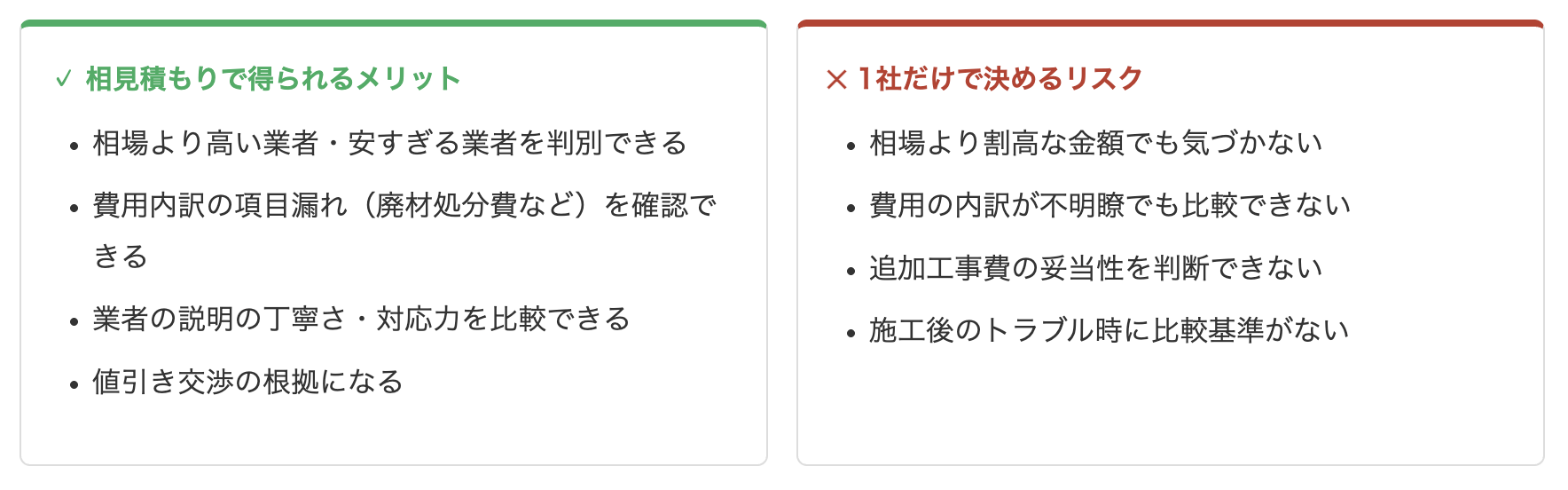 同じ内容のリフォームでも、業者や時期によって数万円の差が生まれることがあります。費用を適正に抑えるための方法を整理します。① 複数業者への相見積もりで相場を確認する