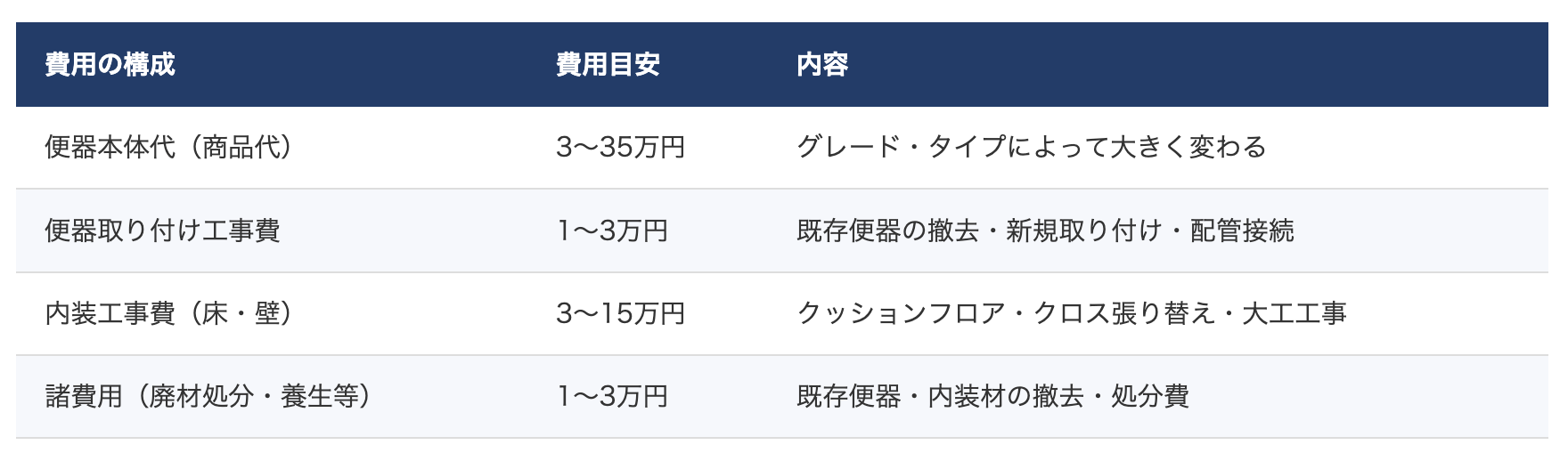 注意 和式→洋式の工事では、床の下地(根太・合板)の状態が劣化している場合、追加の大工工事が必要になり費用が上振れするケースがあります。事前に現地調査を依頼し、下地の状態を確認してもらうことが重要です。