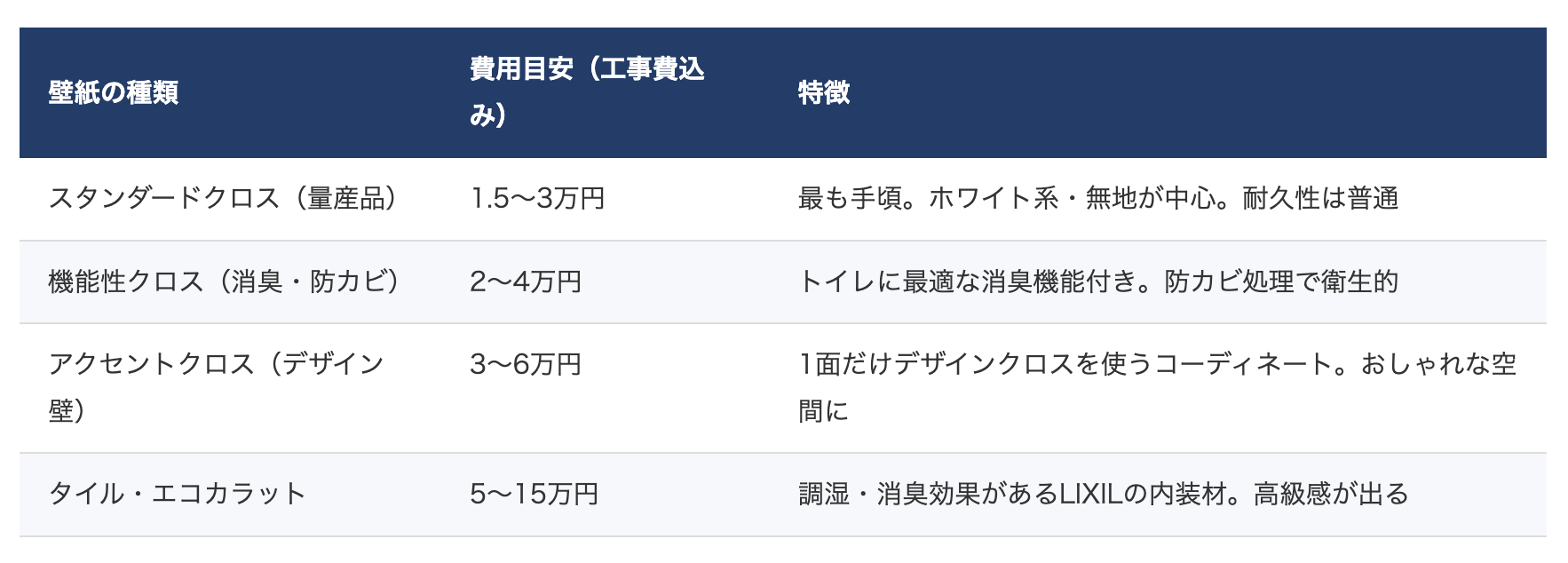 選び方のポイント コストと清潔さのバランスで選ぶならクッションフロア(2〜4万円)がベストです。見た目や質感にこだわりたい場合はフロアタイル(3〜6万円)が人気です。磁器タイルは費用が高くなりますが、20〜30年の耐久性を考えると長期的にはコストパフォーマンスが良い選択です。壁紙(クロス)の張り替え費用