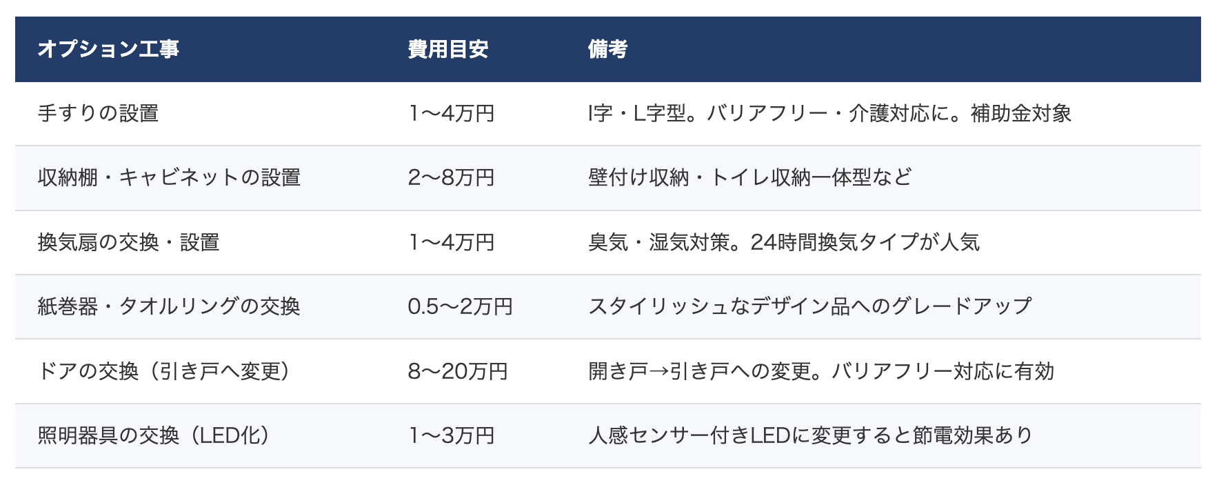 便器・床・壁に加えて、快適性・安全性を高めるオプション工事を合わせて行う方も多くいます。それぞれの費用目安を確認してください。