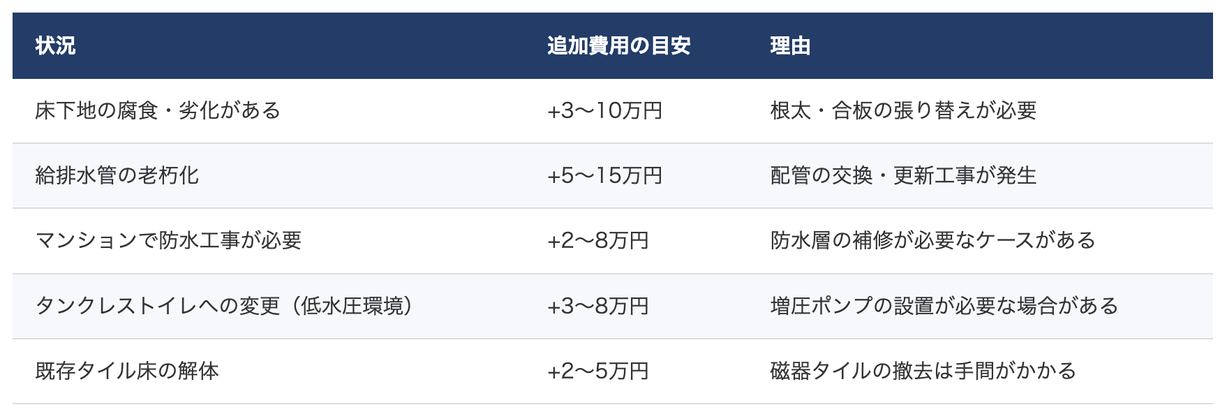 - 和式→洋式:下地工事・配管工事が加わり+10〜30万円になるケースがある