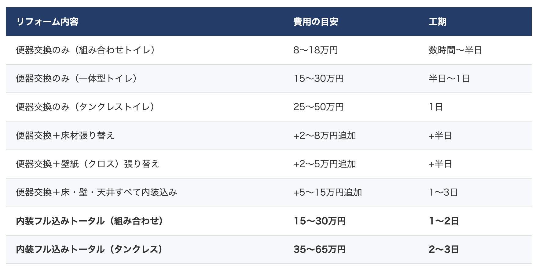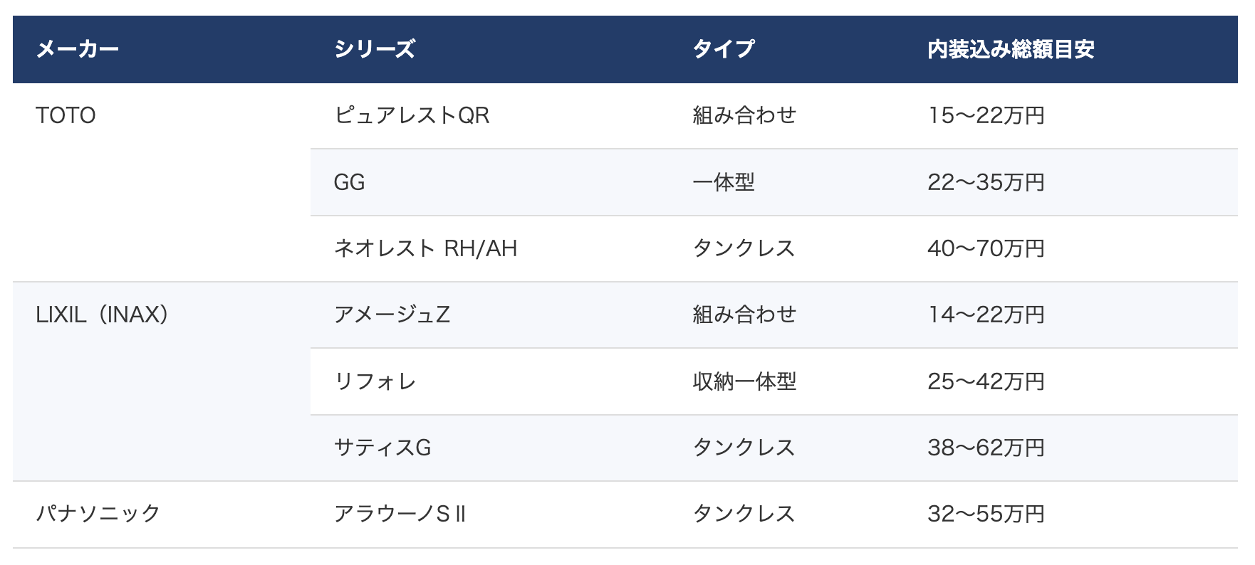 - 便器タイプ別:組み合わせ(15〜28万円)・一体型(22〜40万円)・タンクレス(35〜65万円)