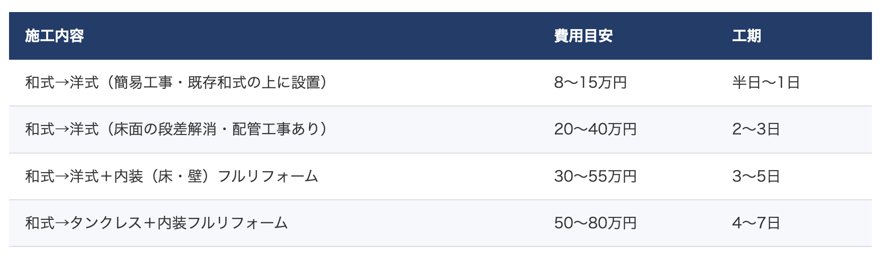 注意 和式→洋式の工事では、床の下地(根太・合板)の状態が劣化している場合、追加の大工工事が必要になり費用が上振れするケースがあります。事前に現地調査を依頼し、下地の状態を確認してもらうことが重要です。