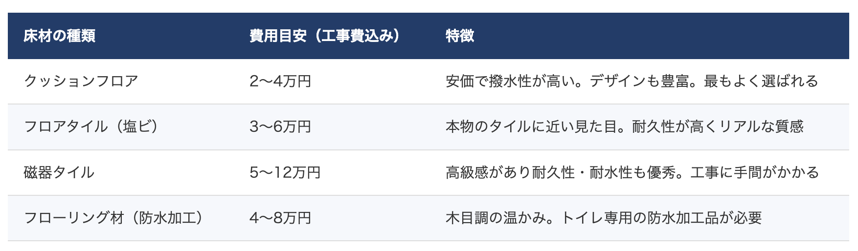 トイレの床材は、清潔に保ちやすい素材への変更が基本です。主な選択肢と費用を比較します。
