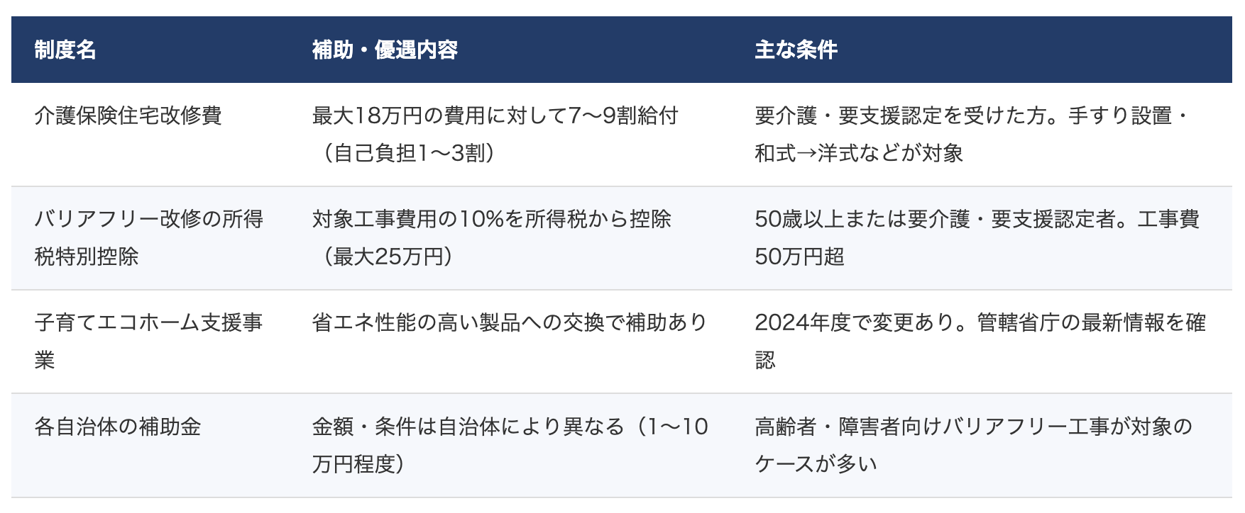 - 補助金:要介護・要支援の方は介護保険住宅改修費で最大18万円の給付が受けられる
