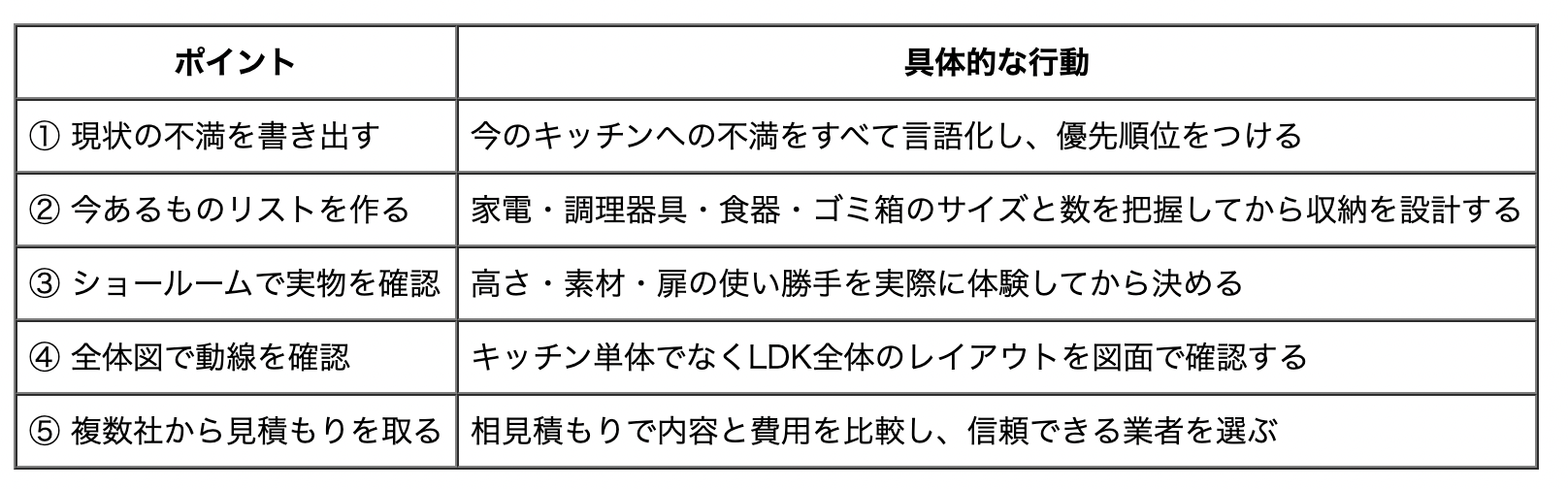 キッチンリフォームでよくある失敗の多くは、「事前の確認不足」と「計画の詰め不足」から生まれます。以下のポイントを押さえておくことで、後悔のないリフォームに近づきます。