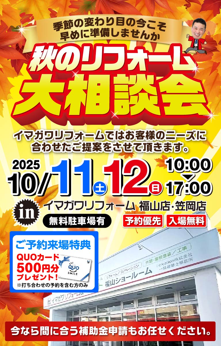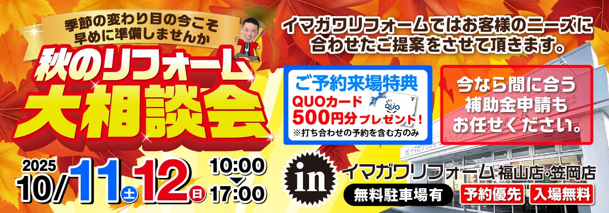 「秋の特得リフォームフェア」を笠岡店・福山店の2店舗で同時開催いたします。
