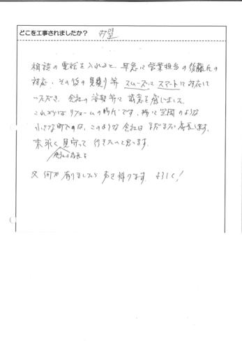 相談の電話を入れると、早急に営業担当の方の対応その後の見積り等 スムーズにスマートに対応していただき、会社の姿勢等に誠意を感じました。 これからは、リフォームの時代です。 特に笠岡のような小さな町では、このような会社は、まだまだ成長します。 末永く会社の成長を、見守って行きたいと思います。 又 何か有りましたら声を掛けます。 よろしく!