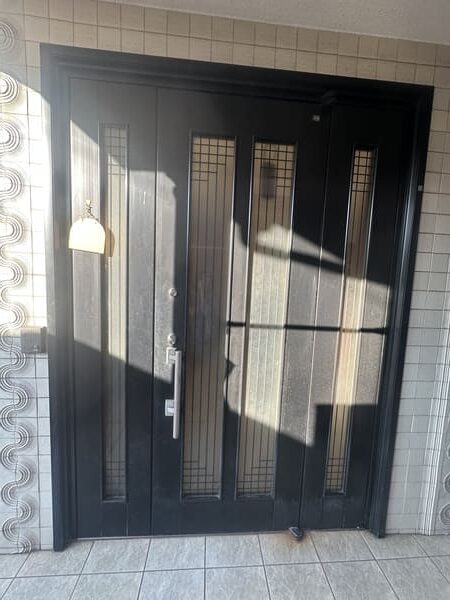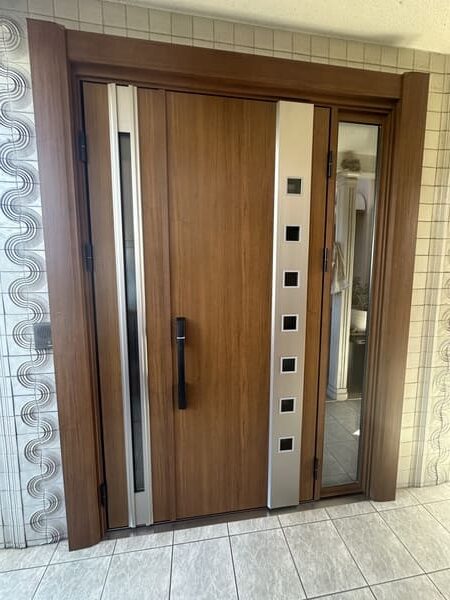 施工前の落ち着いたブラックのドアから、木目調が美しい新しいドアに生まれ変わり、玄関まわりの印象がぐっと明るくなりました!