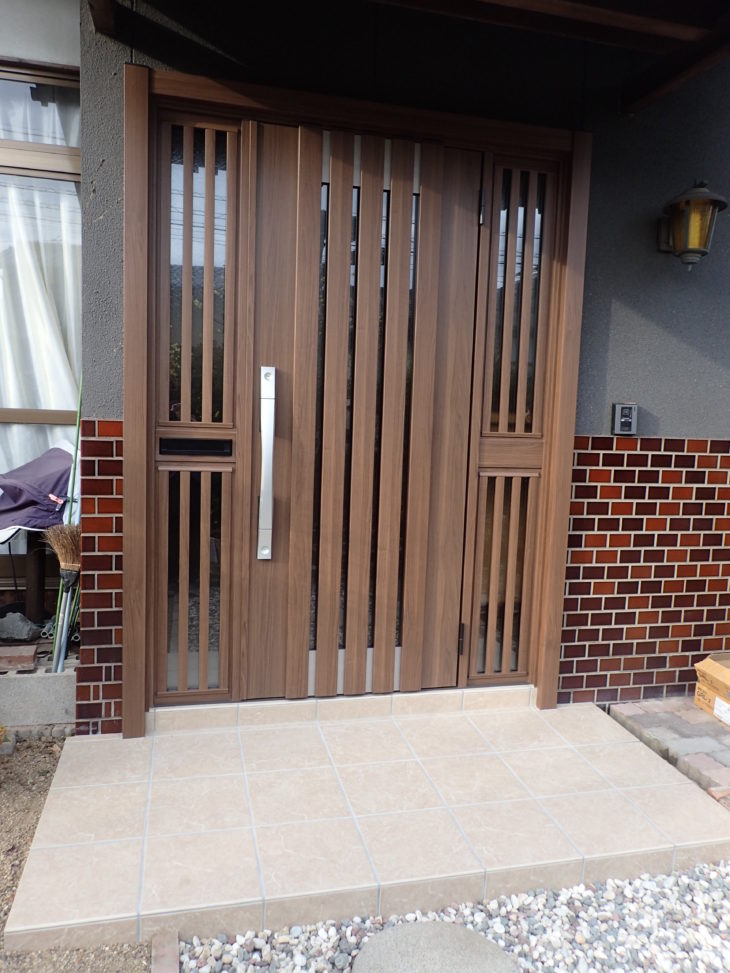 タイルは30㎝角で玄関の色にピッタリ合っていて見栄えよく素敵になりました。